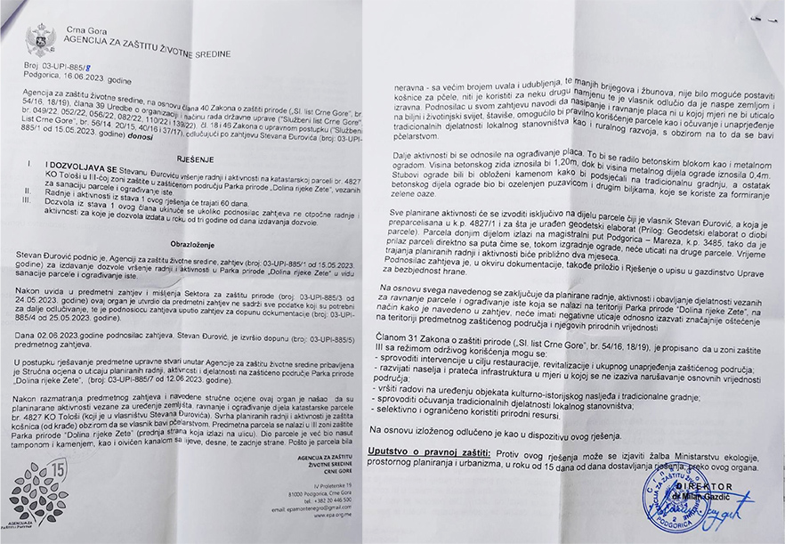 Agencija za zaštitu životne sredine donijela je rješenje kojim se dozvoljava investitoru da vrši radnje gradnje i nasipanja šutom, na zemljištu koje je klasifikovano kao poljoprivredno, koje predstavlja prirodno stanište za mnoge vrste ptica, vodozemaca i biljaka i koje je, na koncu, dio parka prirode ,,Dolina rijeke Zeta“.