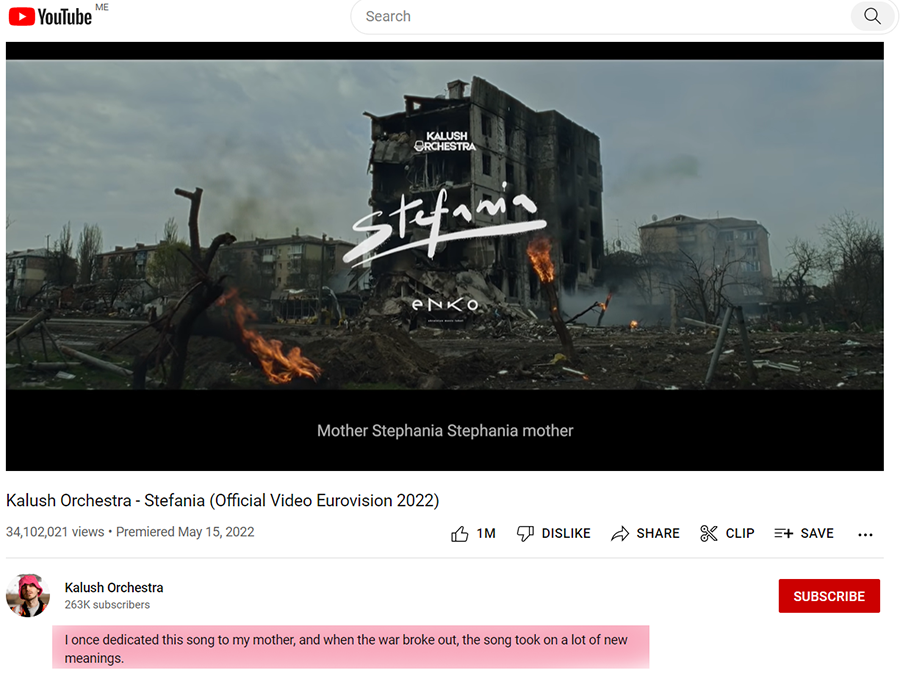 Pri tom, nije na odmet sugerisati da su iz Kalush Orchestra zloupotrijebili i rat za svoju slavu što se vidi u postprodukciji spota za pobjedničku pjesmu Eurosonga. Pjesma Stefania, spakovana u nekom kič-folklor formatu, a posvećena majci, dobila je ratne obrise i finalni spot je sav u drami rata koja nema nikakve veze sa originalnim tekstom.