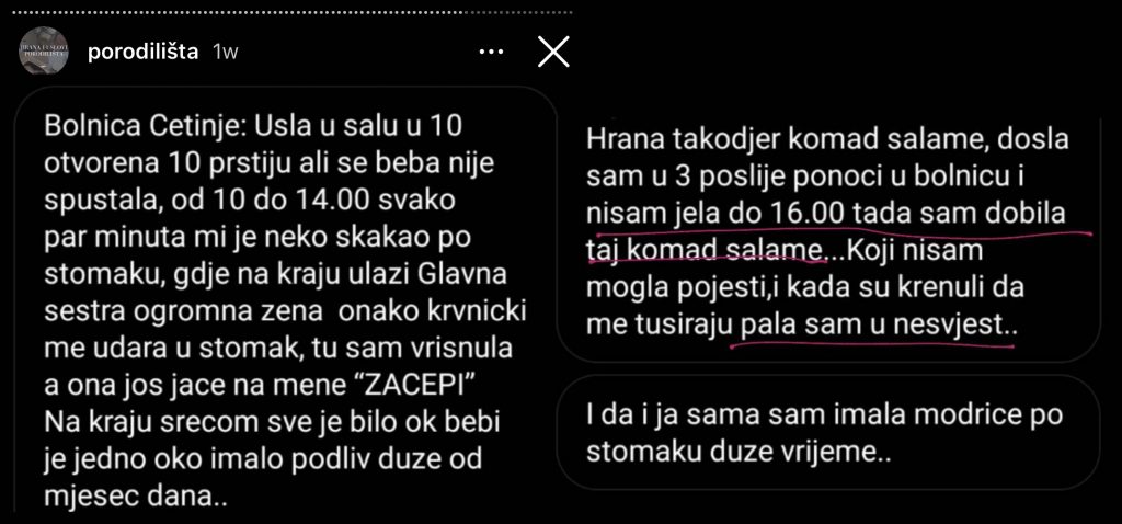 Takođe, na instagram profilu @kriticki pokrenut je razgovor o nasilju doktora i osoblja akušerije na porođaju i lošim uslovima u porodilištima.