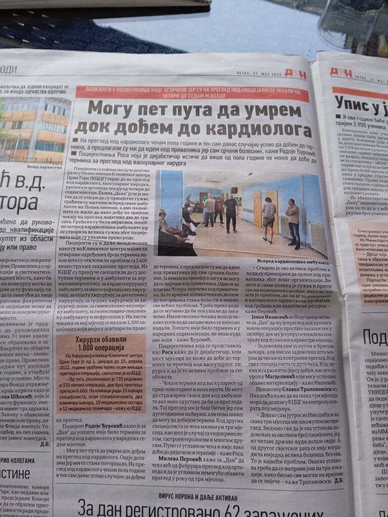 U Crnoj Gori, više od trideset godina je važnija partijska od zdravstvene knjižice. Oni koji imaju partijsku, najčešće ni zdravstvenu ne moraju posjedovati. Prosječan građanin, koji uplaćuje zdravstveno osiguranje, za to vrijeme čeka po sedam mjeseci redovan, regularan, prijeko potreban ljekarski pregled, kao što su to pacijenti koji čekaju na odjeljenjima kod kardiologa, urologa, kardiovaskularnog hirurga i ortopeda u poliklinici Klininičkog centra Crne Gore. Vodeći se takvim analogijama pojedini ljekari, privrednici i druga za to raspoložena lica povećali su, nesrazmjerno potrebama i neopravdano, broj zdravstvenih ustanova koje pružaju usluge stanovništvu (dok za to vrijeme jedan pregled kod kardiologa u privatnim ustanovama košta oko 70 eura).