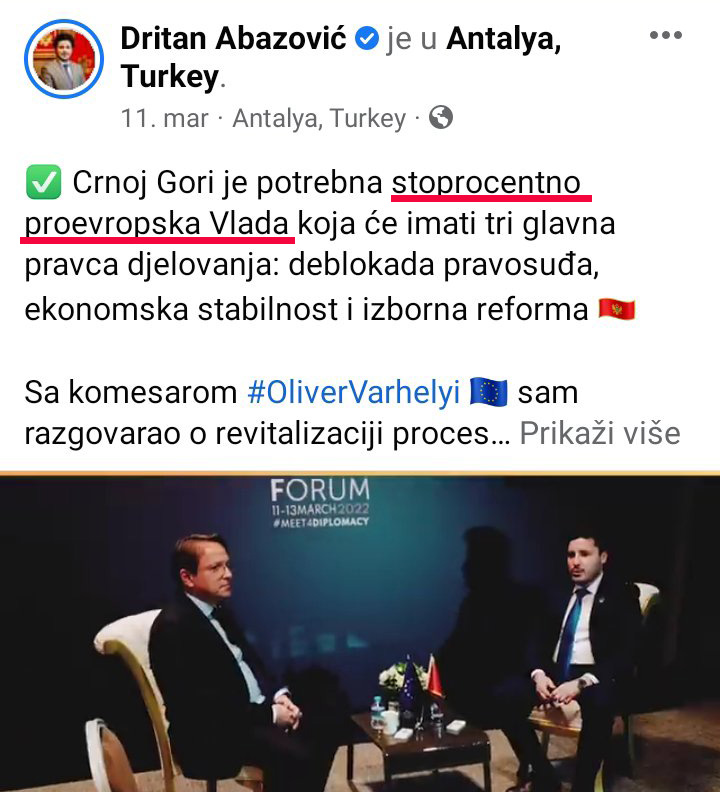 14. Proevropska Vlada – Wanna be evropska Vlada, karakteristična za evropsku periferiju. Determinisana je lažnim evropejstvom – koje podrazumijeva deklarativnu okrenutost Evropskoj uniji – ali sklona partnerstvu sa akterima upitne evropske kredibilnosti: Tačijem, Ramom, Vučićem, Erdoganom… (((ruskim))) oligarsima.