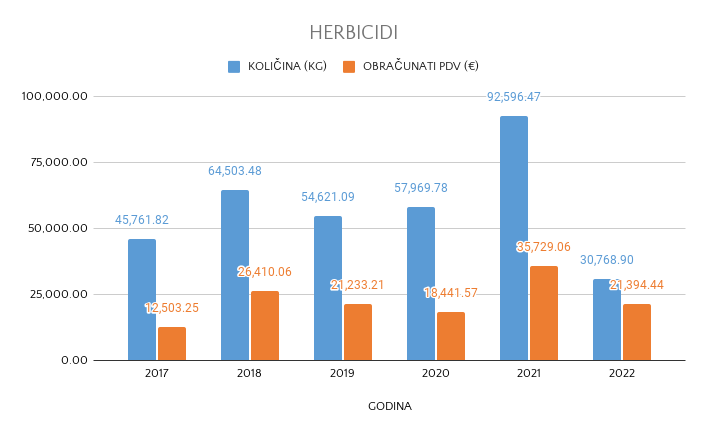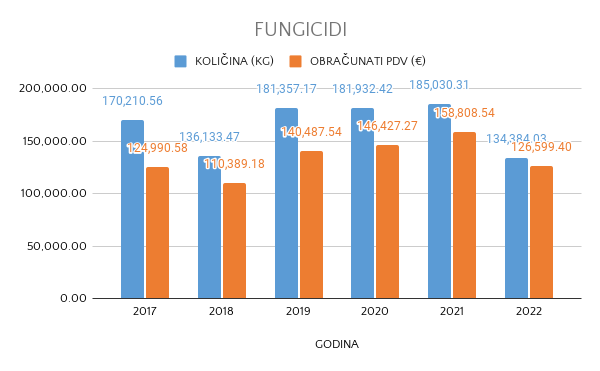 Istražujući ovu temu, na naš upit, od Uprave prihoda i carina smo, takođe, dobili podatke (kroz tekst prikazane graficima), koji govore da je najveća količina fungicida uvezena 2021. godine i to 185 030.31 kg, što odgovara obračunatom PDV-u od 158 808.54 eura.