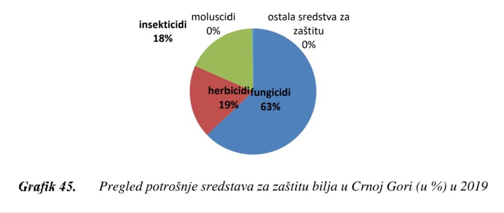 Od svih vrsta sredstava za zaštitu bilja (fungicidi, insekticidi, herbicidi, moluscidi, regulatori rasta biljaka i ostala sredstva za zaštitu), u periodu 2015. do 2019. godine, u Crnoj Gori je dominirala upotreba fungicida, praćena tri puta manjom potrošnjom herbicida i insekticida.