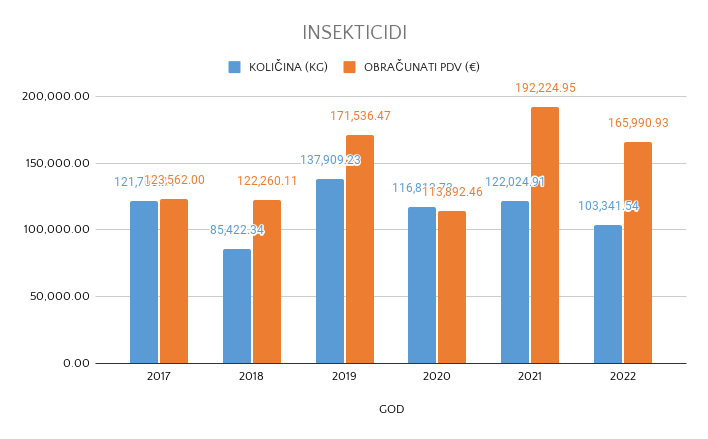 Kada su u pitanju isekticidi, najviše ih je uvezeno 2019. godine, a radi se o brojci koja iznosi 137 909.23 kg iako je, u odnosu na 2021., uvezena manja količina, 122 024.91 kg, koja odgovara najvećem obračunatom PDV-u od 192 224.95 eura.