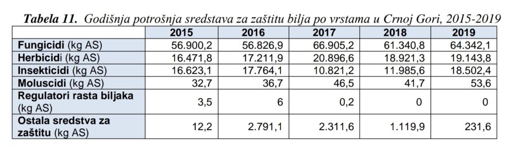 Prema Izvještaju o stanju životne sredine na osnovu indikatora (2017 – 2020), koji je sačinila Agencija za zaštitu životne sredine – u periodu od 2015. do 2019. godine – potrošnja pesticida ima prilično stabilan trend.