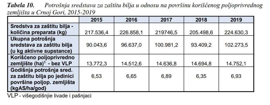 ,,Površina korišćenog poljoprivrednog zemljišta u Crnoj Gori svake godine se povećava, što određena godišnja povećanja, u potrošnji sredstava za zaštitu bilja, održava na stabilnom nivou”, piše u ovom dokumentu.