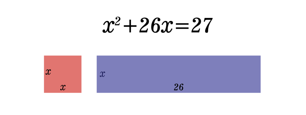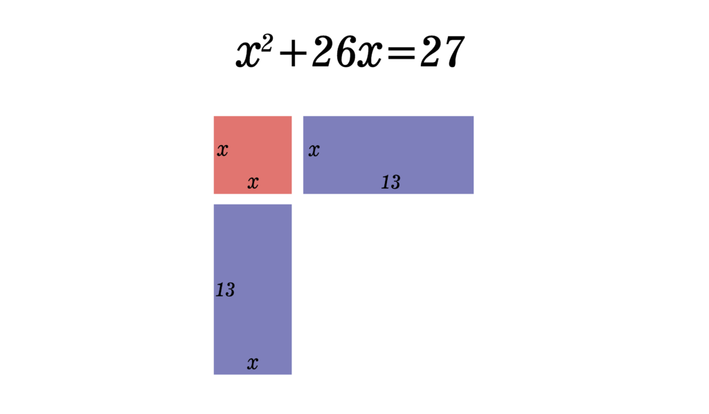 Matematika je nastala kao način da se kvantifikuje opipljiv svijet oko nas, da se izračunaju količine, površine, zapremine… Tako je većina matematike izvođena iz geometrije. Matematičari su mnoge probleme koje danas posmatramo aritmitečki zapravo rješavali geometrijski. Kvadratna jednačina je idealan primjer. Jednačinu x^2+26x=27 (x^2 je x na kvadrat) matematičari su posmatrali kao zbir površina dva pravougaonika od kojih jedan ima površinu x^2, tj ima stranice dužina x, a drugi ima površinu 26x, tj ima jednu stranicu dužine x a drugu dužine 26. To bi izgledalo ovako: