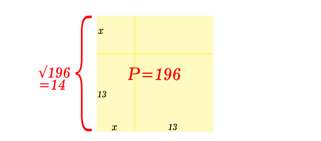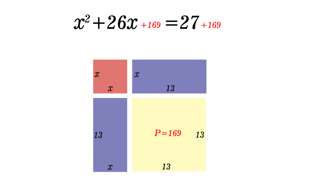 Neki sigurno iz škole pamte “dopunu do potpunog kvadrata” iz zadataka sa polinomima, a taj princip ovako izgleda u geometrijskoj reprezentaciji. Za dopunu do punog kvadrata potreban nam je kvadrat stranica 13. Pošto iz prvobitne jednačine znamo da je ukupna površina postojeća tri kvadrata 27, a dodajemo kvadrat stranice 13 čija je površina 13 na kvadrat, tj 169, onda sa obje strane znaka jednakosti dodajemo 169 i znamo da je ukupna površina punog kvadrata 27+169=196 :