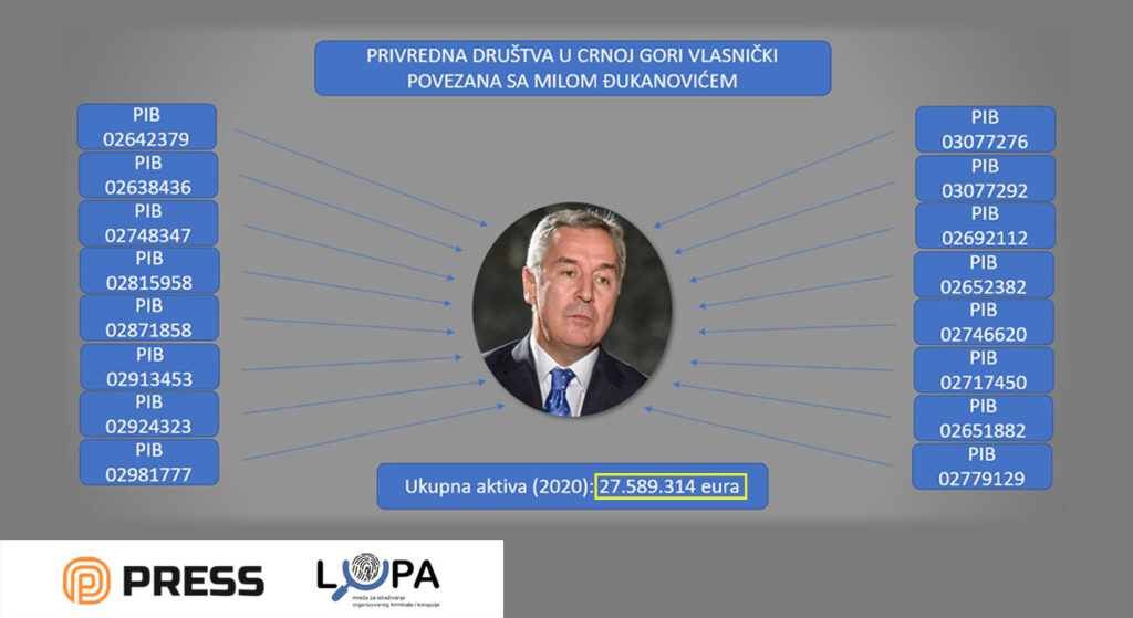 Predsjednik države Milo Đukanović vlasnički je direktno i indirektno povezan sa ukupno 16 aktivnih privrednih subjekata u Crnoj Gori, čija ukupna aktiva prelazi iznos od 27,5 miliona eura. To je utvrđeno u istraživanju koje je sproveo portal PRESS u saradnji sa Mrežom za istraživanje organizovanog kriminala i korupcije – LUPA.