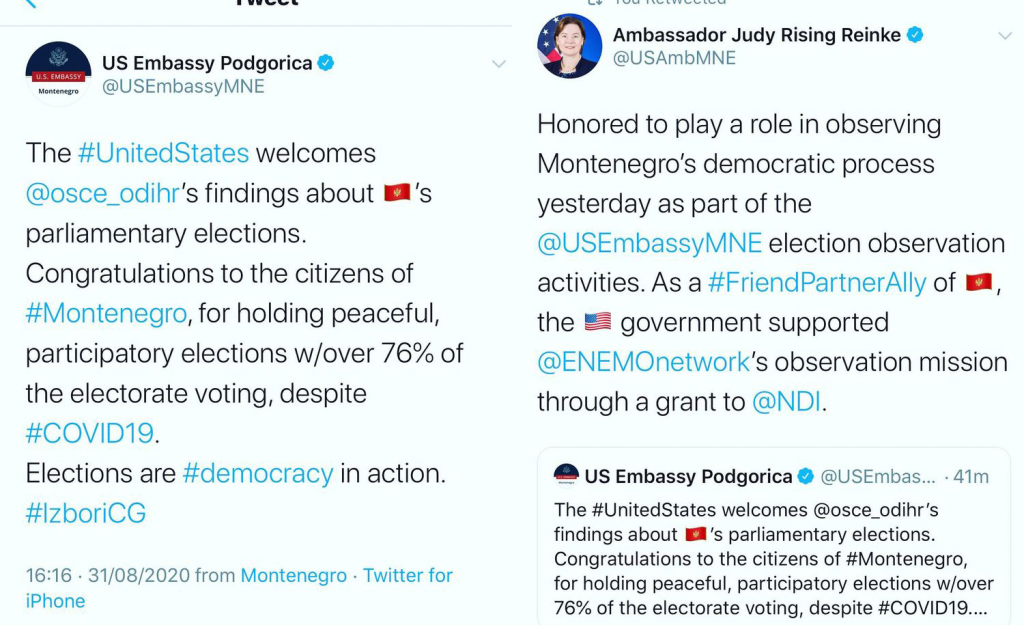 Prije dva dana, Ambasada Sjedinjenih Američkih Država (SAD) u Podgorici čestitala je građanima Crne Gore na održavanju mirnih izbora, sa izlaznošću od preko 76 odsto, uprkos pandemiji koronavirusa.